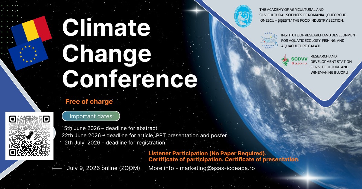 The Academy of Agricultural and Silvicultural Sciences of Romania “Gheorghe Ionescu – Șișești,” the Food Industry Section, the Institute of Research and Development for Aquatic Ecology, Fishing, and Aquaculture Galați, and the Research and Development Station for Viticulture and Winemaking Bujoru are organizing the Climate Change Conference scheduled for July 9, 2026.